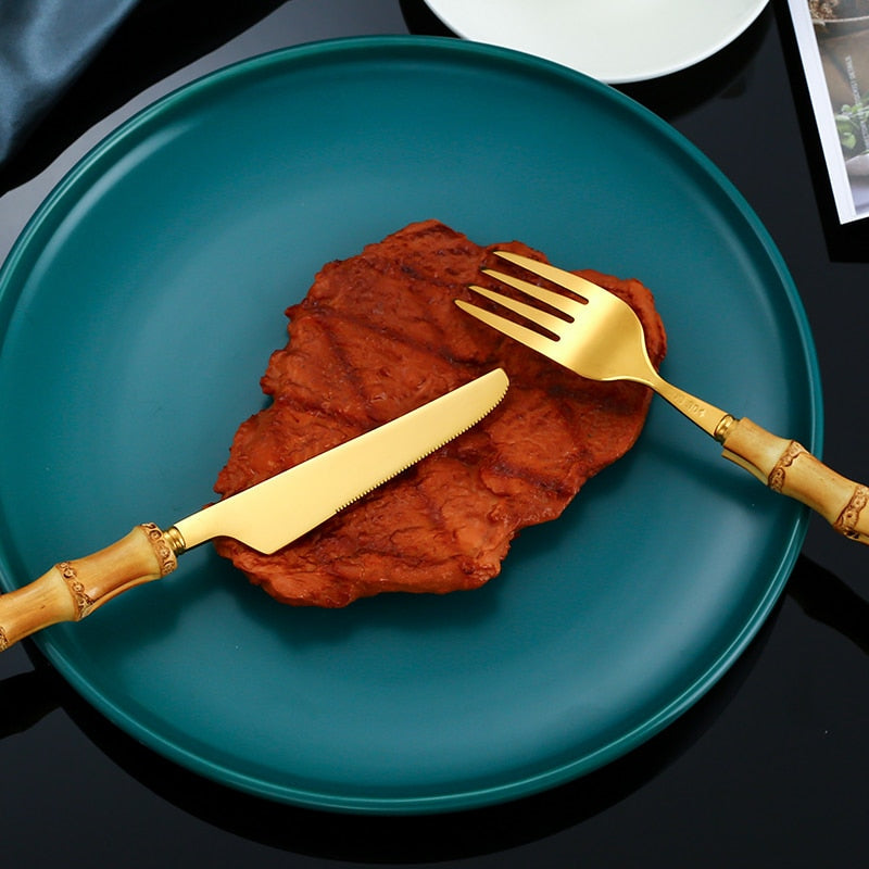The retro stainless steel cutlery set is equipped with handmade bamboo handles